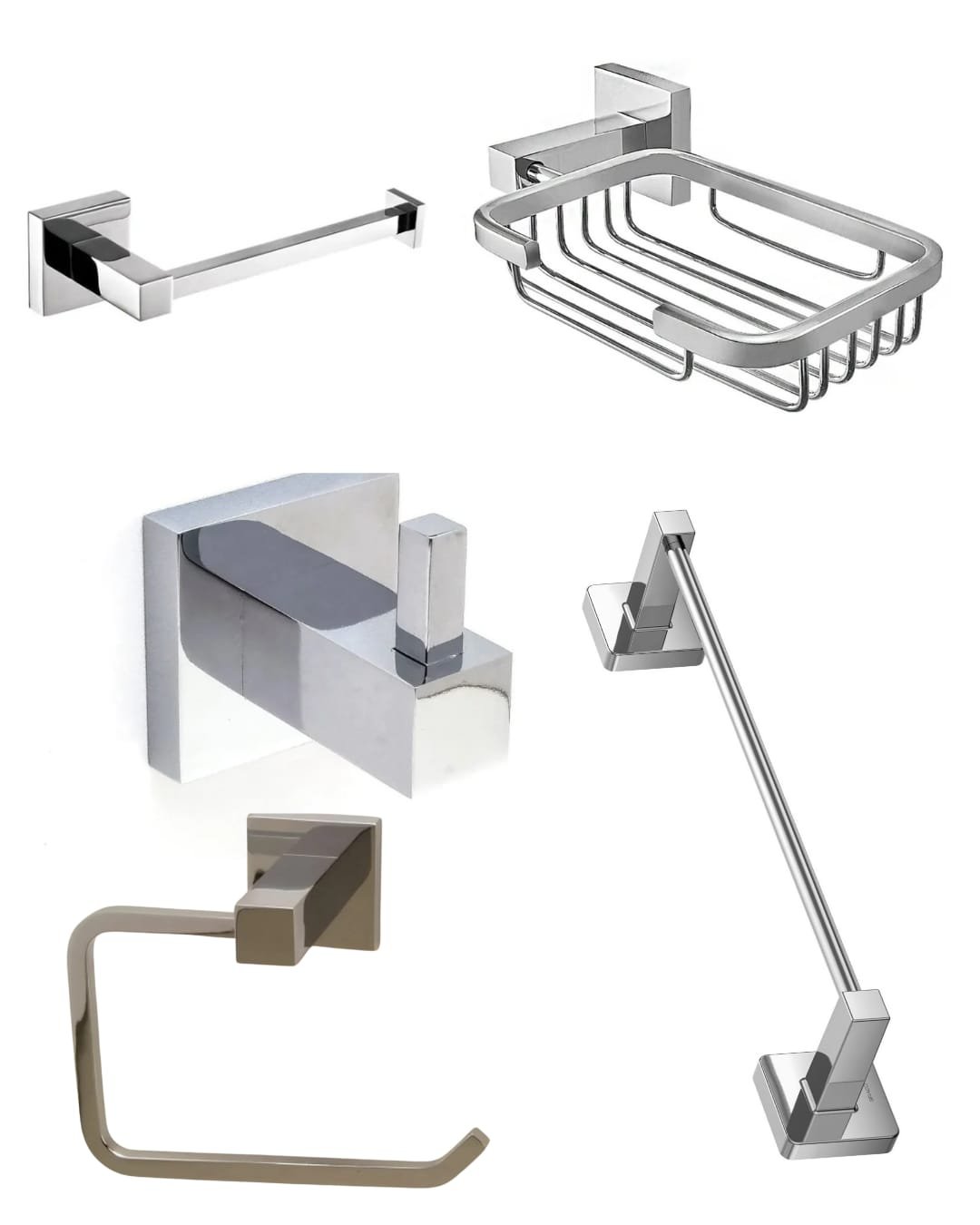Kit de Acessórios para Banheiro em Metal – 5 Peças (1 Portas-Toalhas, 1 Porta-Espuma, 1 Saboneteira, 1 Porta-Papel Higiênico e 1 Cabide Simples de Parede)